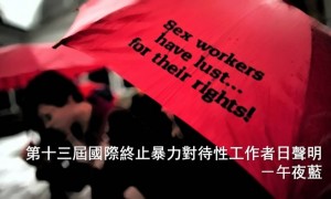 午夜藍一直致力建立男性和跨性別性工作者互助網絡及維護其工作權益。我們發現性工作者於香港時常遇到源自法律及執法機構的暴力對待。今天是第十三屆國際終止暴力對待性工作者日,我們呼籲香港政府及執法部門正視性工作者所遭受的不公義,檢討過時法例,停止執法濫權,令其人權真正得到保障。
